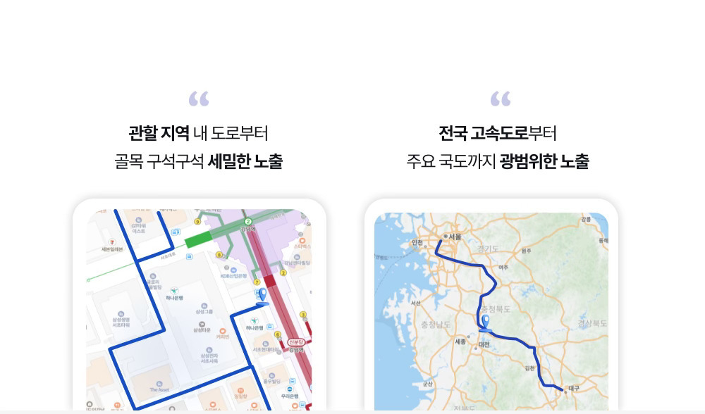 하지만 커넥트럭의 화물차 광고는 다릅니다. 대형 화물차는 서울에서 대구까지, 전국 고속도로 어디서든 광범위하게 광고를 노출할 수 있어요. 이 뿐만 아니라, 시 군 구와 같은 관할 구역 내에서는 골목 구석구석까지 들어가서 정차할 수 있기 때문에 세밀한 타겟팅이 가능합니다.
